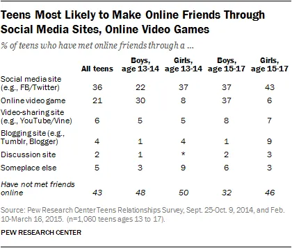Çevrimiçi arkadaşlıkların büyük bir kısmı, Facebook ve Instagram gibi sosyal medya sitelerinde kuruluyor. Çevrimiçi arkadaş edinen gençlerin %64'ü, sosyal medya aracılığıyla biriyle tanıştıklarını belirtiyor. Ağ bağlantılı video oyunları ise %36 oranında yeni arkadaşlıkların kurulduğu platformlar arasında yer alıyor (PewResearch, 2015). Ayrıca, kızların diğer bireylerle sosyal medya aracılığıyla tanışma olasılığı erkeklere göre daha yüksek (%78'e karşı %52), erkeklerin ise çevrimiçi oyun platformlarında yeni arkadaşlar edinme olasılığı daha yüksek (%57'ye karşı %13) olarak görülüyor.